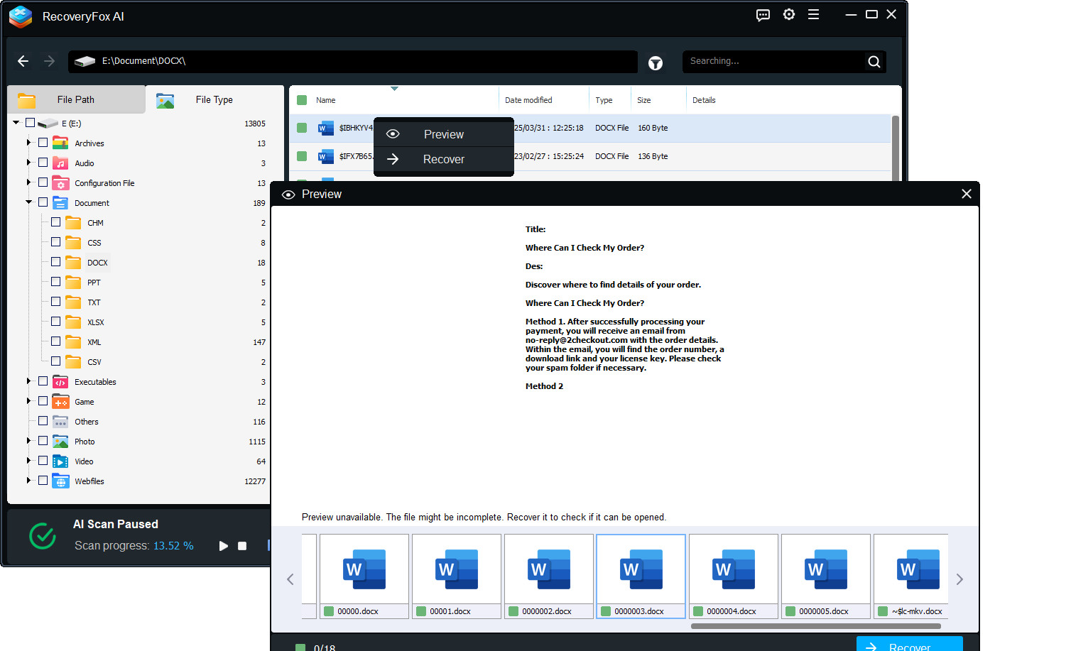 Zwei Scanmodi sorgen für Treffer: Quick Scan für frisch gelöschte Daten und ein tiefer AI Scan für formattierte Datenträger, gelöschte Partitionen oder logisch beschädigte Volumes. Vor dem Speichern lassen sich Funde komfortabel in der Vorschau prüfen. Das erhöht die Qualität der Ergebnisse und spart Zeit.